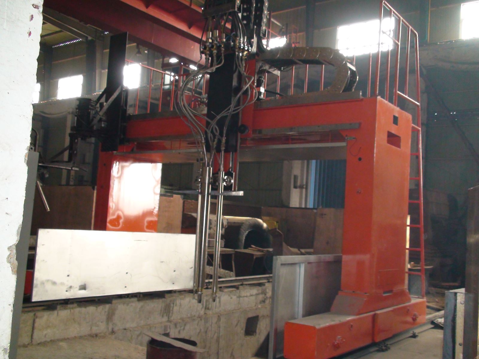● 龍門所配二臺焊機、保護氣氣瓶(至少2個)、控制柜等均放在龍門兩側(cè)托架上,隨龍門一起移動,進龍門的外部供電線纜采用滑線供給,使得龍門移動范圍加大。